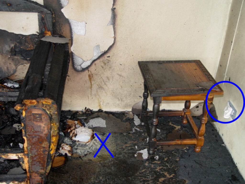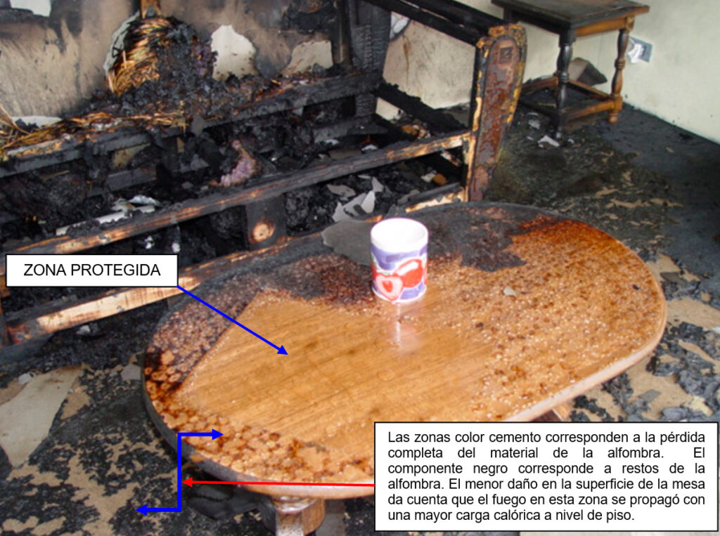 La fotografía F7 muestra claramente el mayor daño de la mesa (en el sector izquierdo de ella), que es concordante con el flujo de calor radiado desde el mueble tapizado (poliestireno). Sin embargo, en el punto de origen marcado con una X, donde se encontraba un basurero, se añadieron 200 cc de gasolina. Esto explica el intenso daño en las patas de la mesa y da cuenta que el aporte calórico preponderante fue a nivel bajo y no por la radiación desde el techo. En este sentido, el derretimiento del material plástico del enchufe y el escaso daño de la superficie de la mesa en ese sector (vértice) son concordantes con una fuente de calor principalmente a nivel bajo.