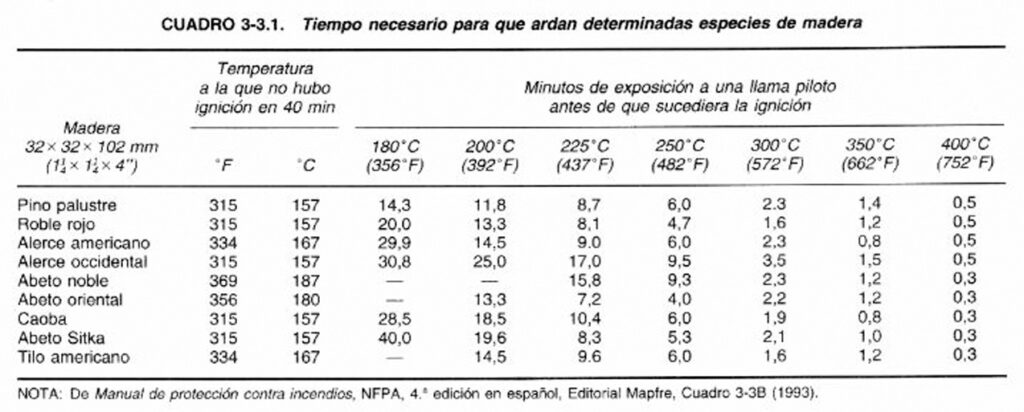 Al igual que otros materiales, las maderas tienen distintos puntos de ignición. Se han efectuado pruebas en laboratorios, sometiendo la madera a contacto con una llama piloto de 200ºC durante un tiempo determinado. En esta prueba, por ejemplo, el pino palustre ardió a los 11,8 minutos de exposición, comparado con el alerce occidental, que lo hizo a los 25 minutos.