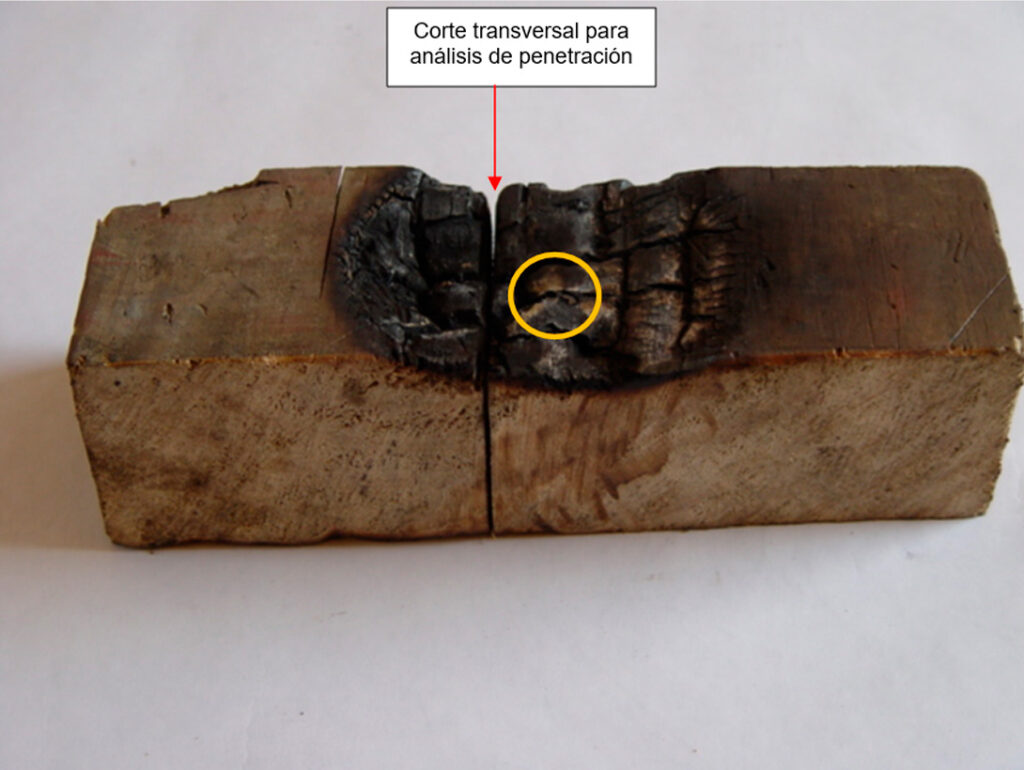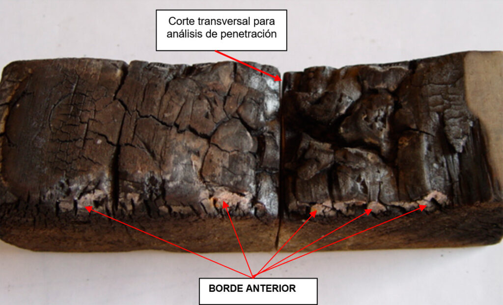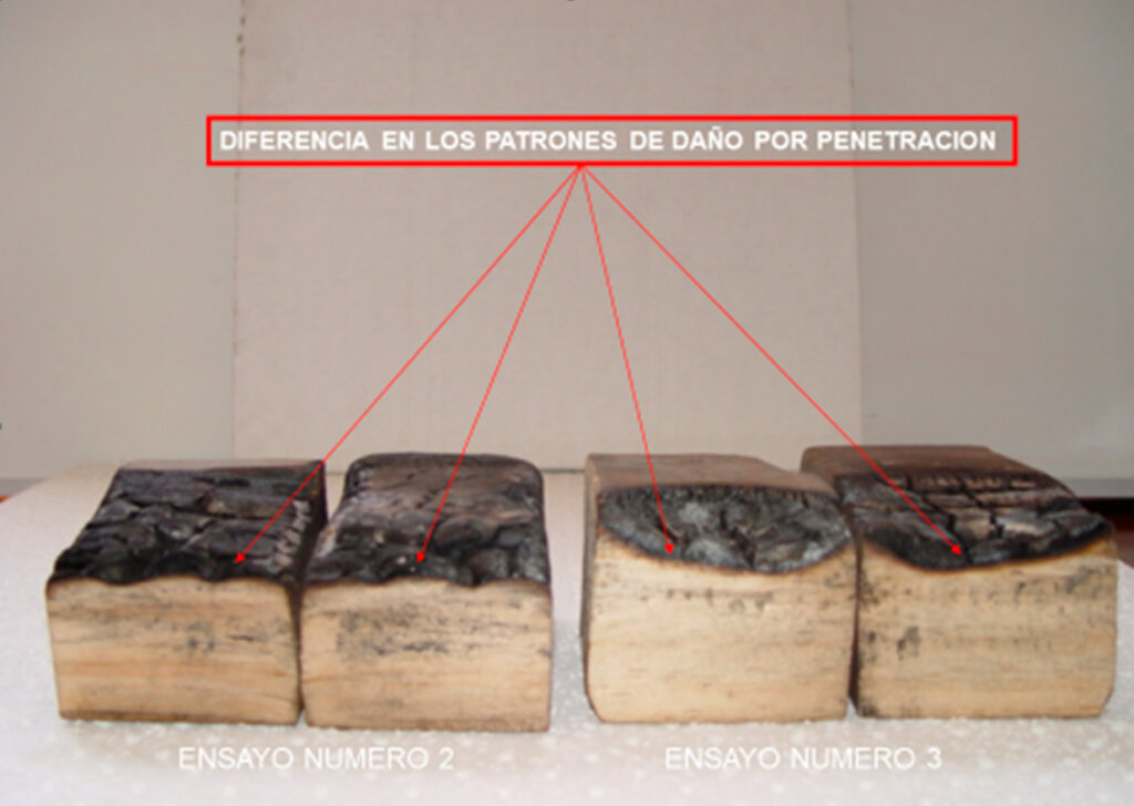 Ahora bien, si analizamos el protocolo de ambos ensayos para un mismo tipo de muestra, debe llamarnos la atención que el mismo espécimen fue sometido a condiciones de afectación por fuegos diferentes y por tanto los daños que presentan son distintos. Esto es aparentemente inoficioso para una correcta interpretación de los resultados (parámetros de control). No obstante, la forma en que se debió aplicar la energía de activación, que fue diferente en cada caso, es un indicativo de las especiales características de la madera y su reacción ante una fuente de calor.